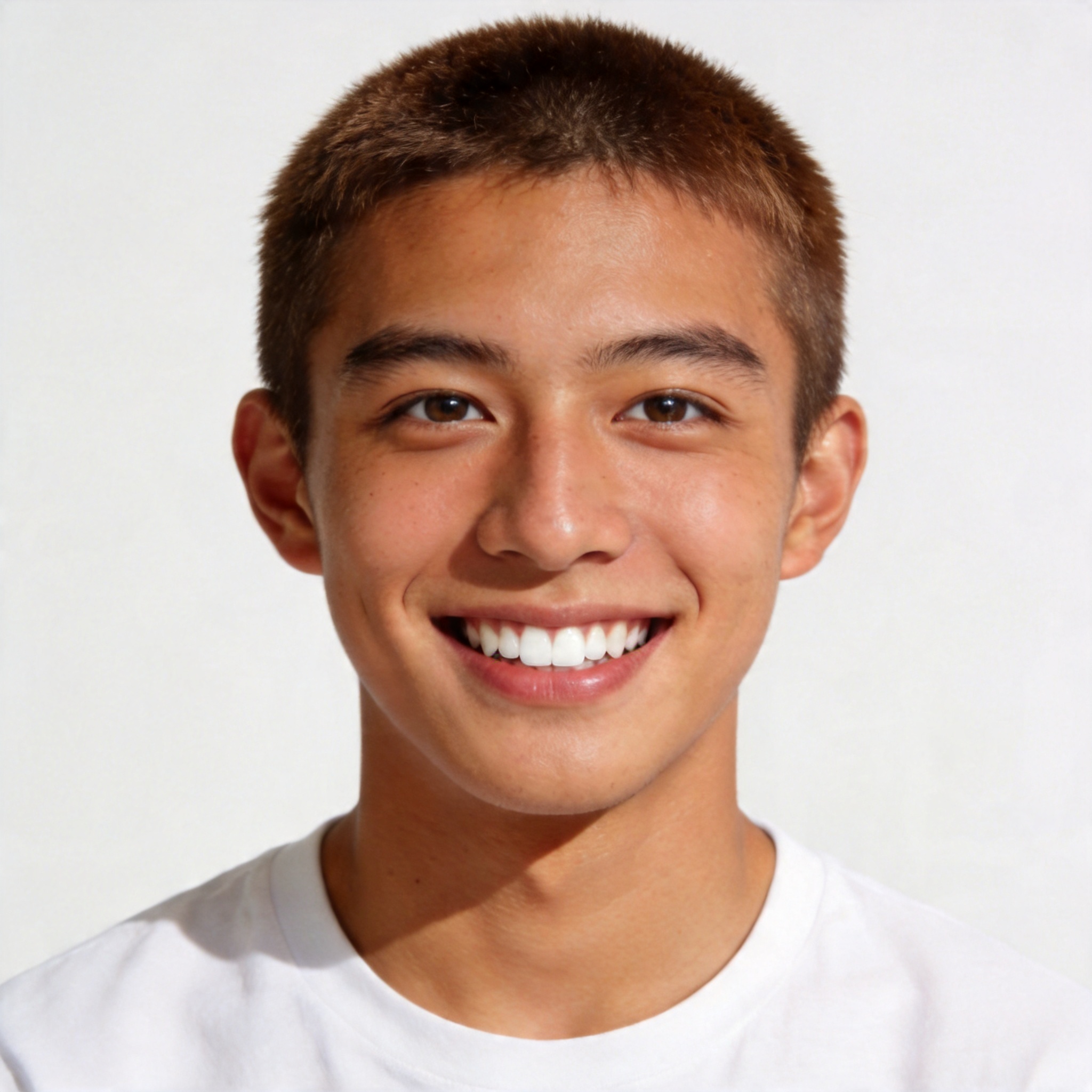 20岁,阳光帅气(180cm),小麦肤色,短寸或微卷棕发,喜欢白色T恤或运动外套,笑起来牙齿很白