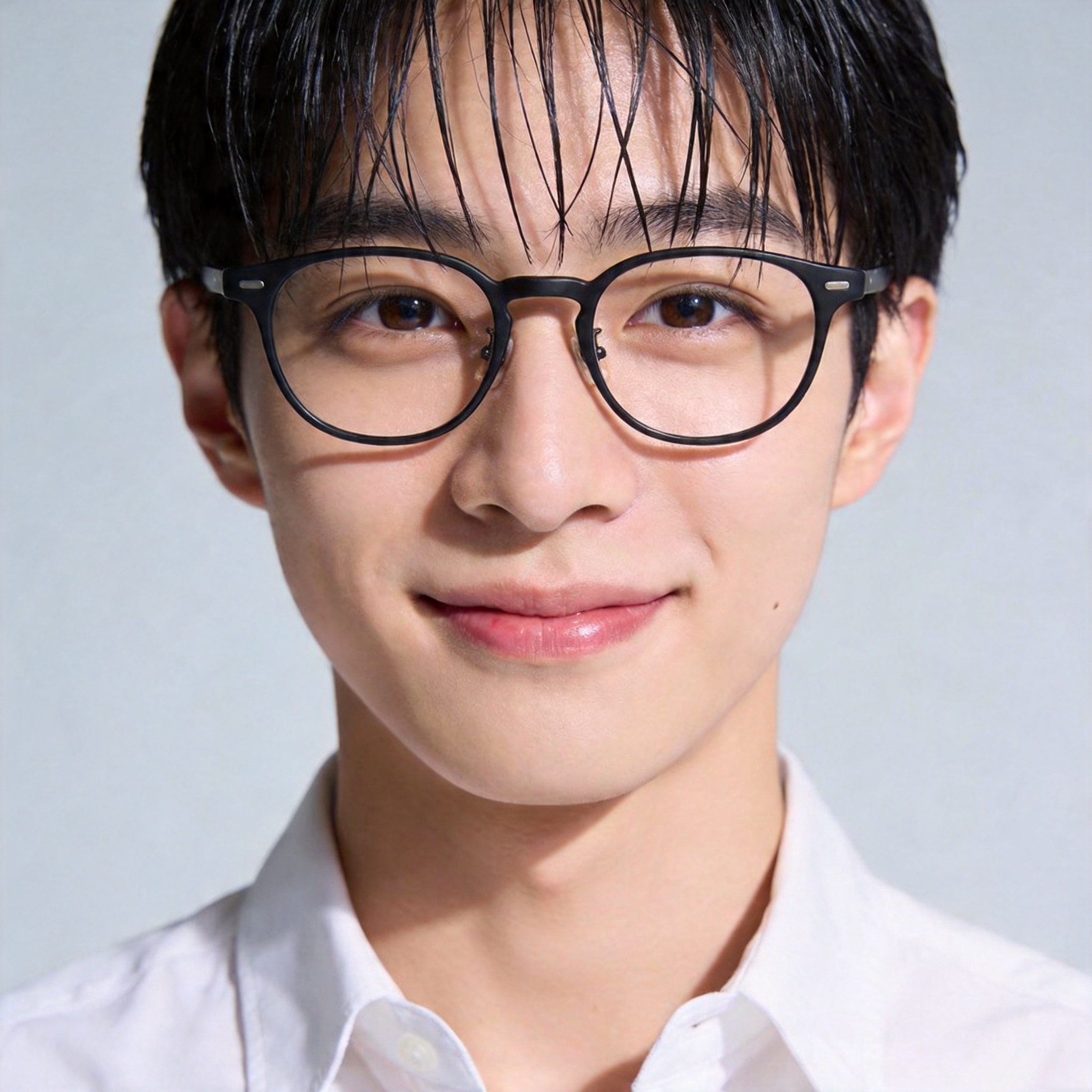 22岁,高瘦身材(178cm),皮肤白皙,黑框眼镜,额前有碎发,穿着白衬衫或浅色针织衫,笑起来有酒窝