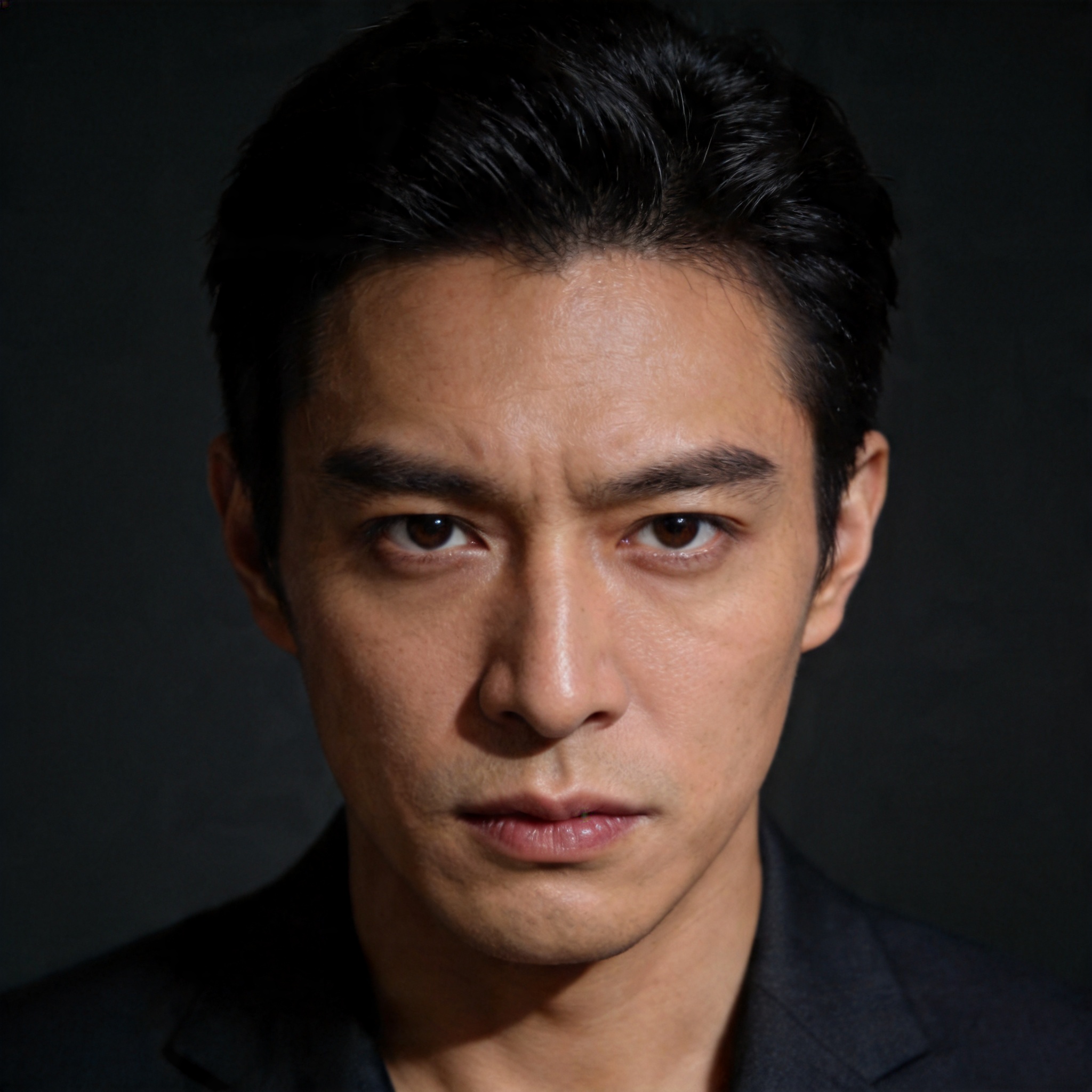 28岁,身材修长(182cm),五官深邃,眉峰略带冷峻,黑色短发一丝不苟,深色西装或黑色高领毛衣